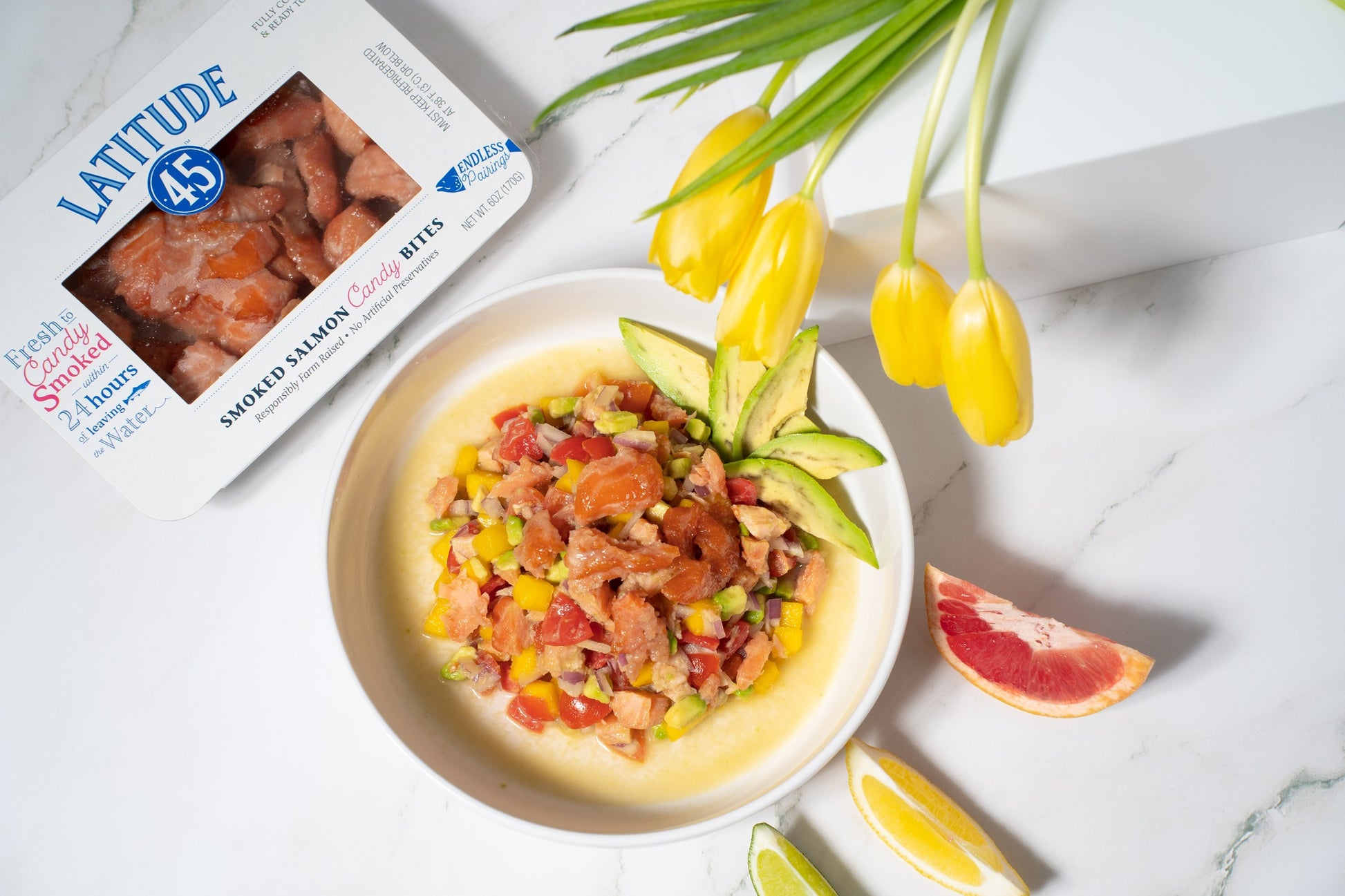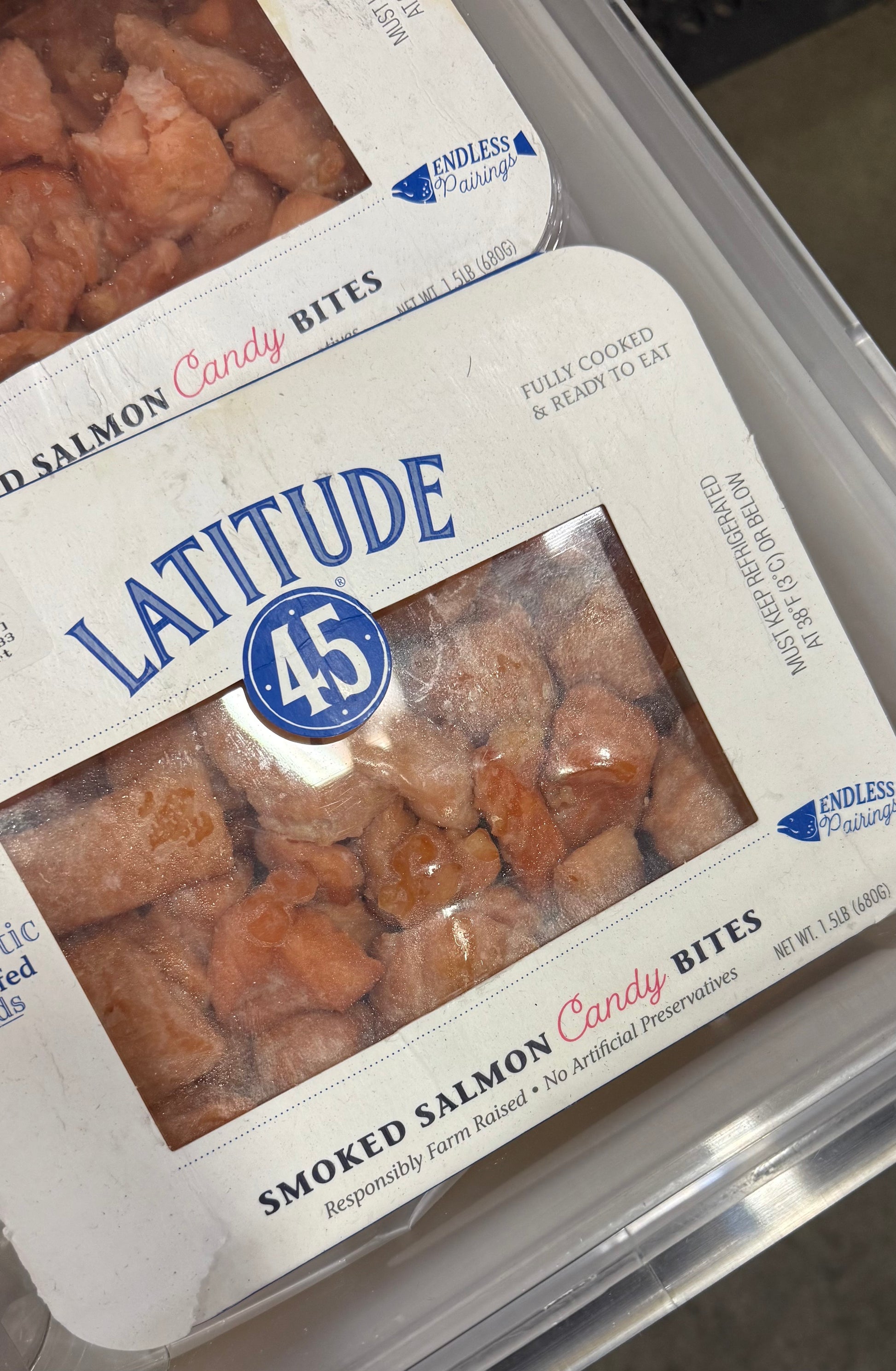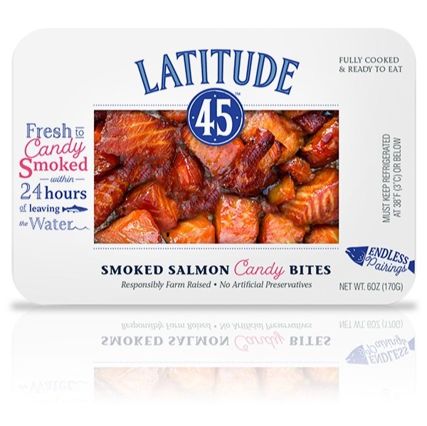 Experience the deliciousness of LATITUDE 45 1.5 POUND SMOKED SALMON CANDY BITES, handcrafted with only the freshest farm-raised Atlantic salmon, a perfect blend of salt and sugar, and infused with the rich flavor of natural hardwood smoke.Preparation: